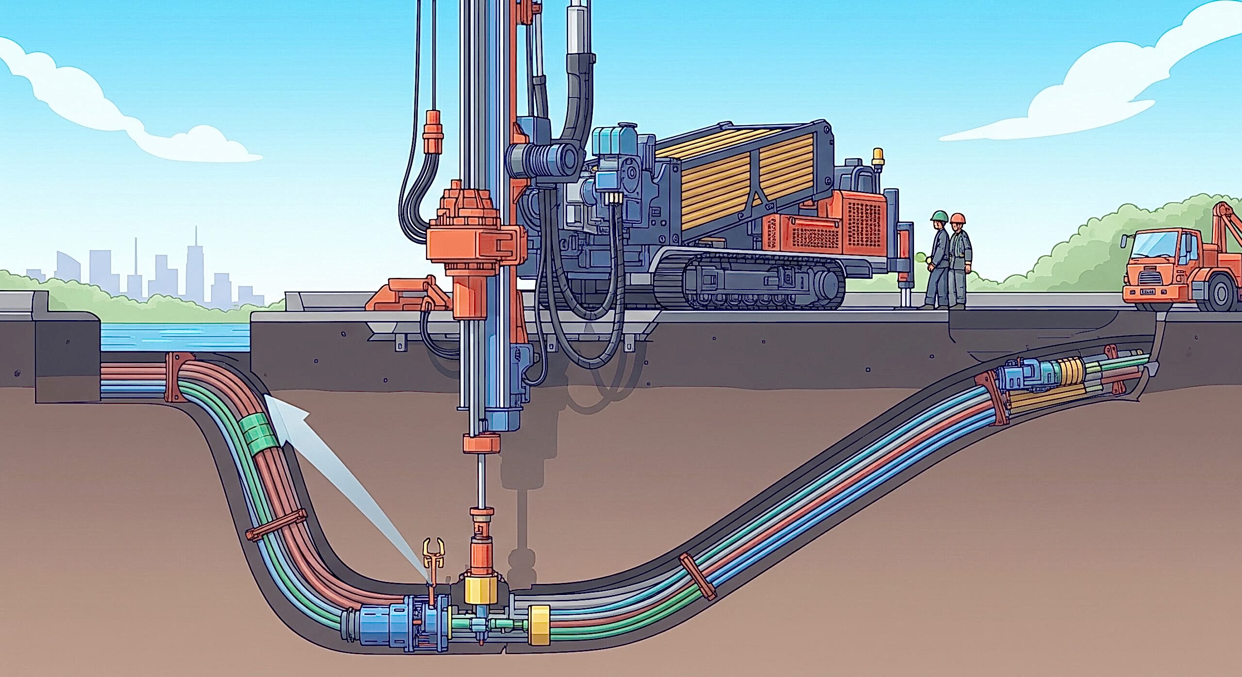- Boru Çekme: Boru veya kablo, genişletilmiş tünelden sondaj makinesi tarafından çekilerek yerine yerleştirilir.